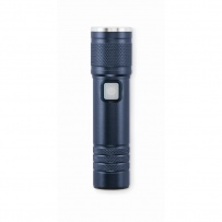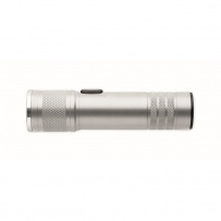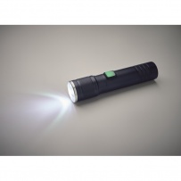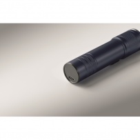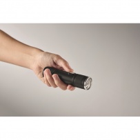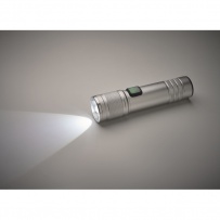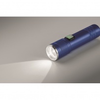 Rechargeable and expandable COB light torch in recycled aluminium. 100 lumen with 3 light settings and zoom function. Built-in 800 mAh rechargeable battery. Charging cable included.