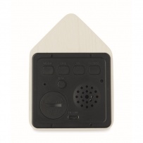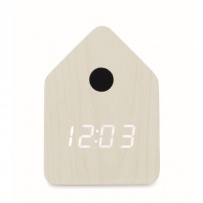Small MDF desk clock including a built-in alarm with bird cuckoo voice and temperature display. Bird cuckoo voice every full hour and during alarm. White LED display. Sound is automatically silenced between 22.00h to 06.00h. 5 mins snooze intervals