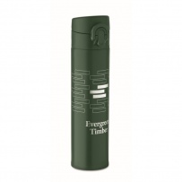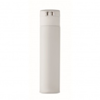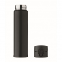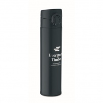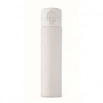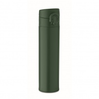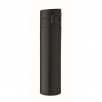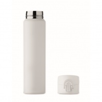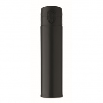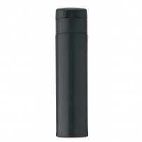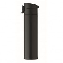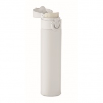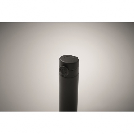 Double wall drinking bottle in recycled stainless steel (90% recycled stainless steel and 10% stainless steel) with security lock on the lid and press-to-open option. Leak free. Capacity: 300ml.