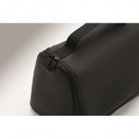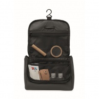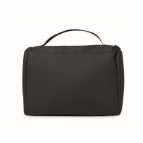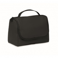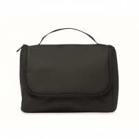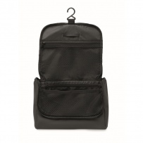 Kosmetiktasche aus weichem PU. Großes Hauptfach, inneres Netzfach mit Reißverschluss und weiteres Netzfach. Aufhänger und 210D RPET-Futter.