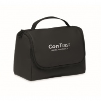Sac ? cosmétique en PU souple avec crochet de suspension et doublure en RPET 210D. Un grand compartiment principal avec un compartiment intérieur en filet zippé et un compartiment en filet.