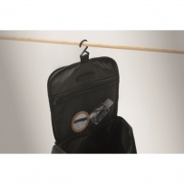 Cosmetic organiser bag in soft PU with hanging hook and 210D RPET lining. One large main compartment with inner zippered mesh compartment and 1 mesh compartment.