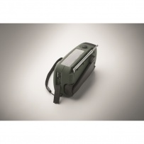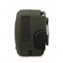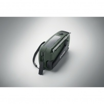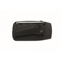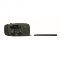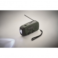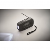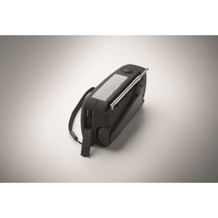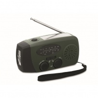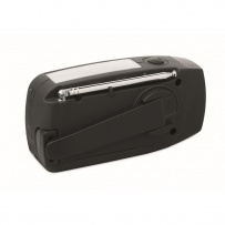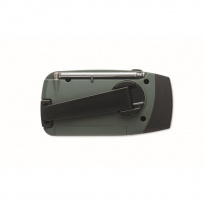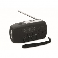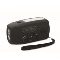 Radio AM/FM portable en ABS avec torche LED (2 réglages) et un Powerbank 1200mAh pour la recharge d'urgence. Alimentée par énergie solaire et par manivelle.