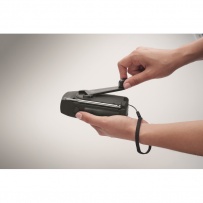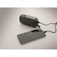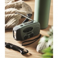 Portable AM/FM radio in ABS with LED Torch (2 settings) and a 1200mAh Power bank for emergency charging. Self powered by solar and hand crank.