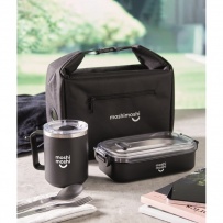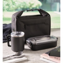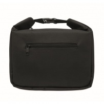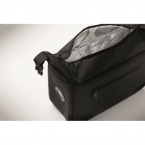 Kühltasche aus 600D RPET mit Anzeige der Innentemperatur. Hauptfach mit Reißverschluss. Seitliche Reißverschlusstasche, Steckverschluss. Isolierung: 3 mm PE-Schaum und Aluminiumfolie. Füllmenge: 5 L.