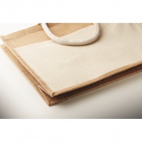 Sac shopping en jute laminé et toile de coton 280 gr/m2 avec poignées en corde. Comprend une grande poche ouverte sur le devant.