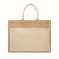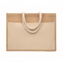 Shopping bag made of laminated jute and 280 gr/m2 cotton canvas with cord handles. Includes large open front pocket.