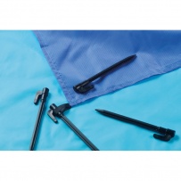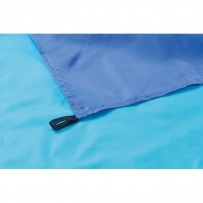 Tapis de plage léger en polyester 210T mesurant 200x210cm. Comprend 4 crochets noirs et une pochette ? cordon assortie pour un transport facile.