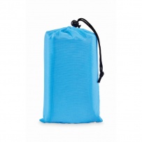 Lightweight beach mat in 210T polyester measuring 200x210cm. Includes 4 black hooks and a matching drawstring pouch for easy carrying.