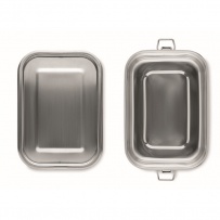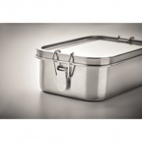 Lunchbox z recyklingowanej stali nierdzewnej (90% stali nierdzewnej z recyklingu i 10% stali nierdzewnej) z bezpiecznymi bocznymi klamrami i zaokrąglonymi rogami. Pojemność: 750 ml.