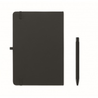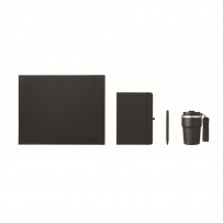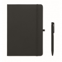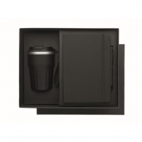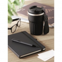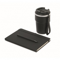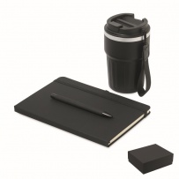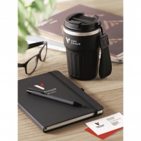A5 notebook, recycled aluminium ballpen, and 350 ml double wall recycled stainless steel tumbler with PP sip lid and strap in gift box.
