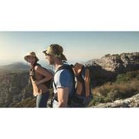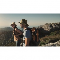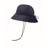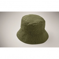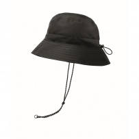 Water repellent fisherman hat made of polyester, includes self material pouch with ABS carabiner. 64 gr/m2.