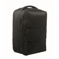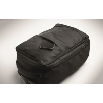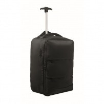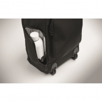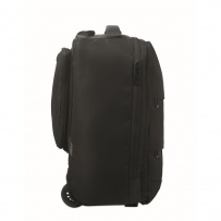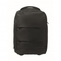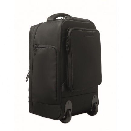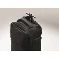 Backpack trolley in 290T RPET polyester with three front zip pockets, padded 15'' '' laptop compartment, and zippered cooling section. Features padded back, straps, and rear zip strap compartment.