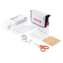 Apteczka w pokrowcu z przednią kieszonką i mocowaniem do paska, główna przegroda na zamek, 14 el., w tym: bandaż trójkątny, bandaż PTB, nożyczki, 4 plastry, 4 płatki nasączone alkoholem, 2 agrafki oraz taśma, ślad węglowy produktu: 0,85 kg CO2