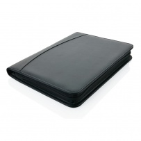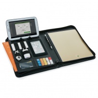 A4 PU zippered tech portfolio. Inside: a phone/tablet stand, phone holder with see-through window which allows you to view and access your mobile device. Suitable for iPhone 6 & Samsung S6 etc. Gadget holders for example usb, charging cable & powerbank. 5 card holders and one ID holder. Expandable file pocket for documents or tablet. Including 1 A4 memopad with 20 sheets. Compatible with all iPad, Android, and Microsoft Windows tablets.
