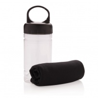 Microfibre cooling towel 100% free of chemicals. 98% sun blocking function up to UV 50+ protection. The towel can be easily used by adding some cold water to the bottle creating a cool towel for fast refreshment. The bottle is made out of PP with ABS top and carabiner to take along on outdoor activities.