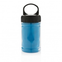 Ręcznik chłodzący z mikrofibry w pojemniku z PP, wieczko z ABS, ochrona przeciwsłoneczna na poziomie 98% i do UV 50+, funkcja chłodzenia po wlaniu zimnej wody do butelki, karabińczyk w komplecie, wymiar po rozłożeniu 77 x 30cm, ślad węglowy produktu: 0,8 kg CO2