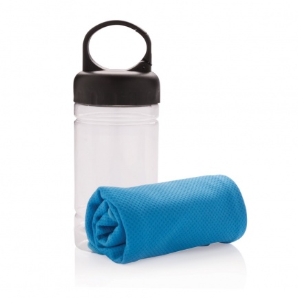 Microfibre cooling towel 100% free of chemicals. 98% sun blocking function up to UV 50+ protection. The towel can be easily used by adding some cold water to the bottle creating a cool towel for fast refreshment. The bottle is made out of PP with ABS top and carabiner to take along on outdoor activities.