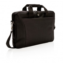 Carry your 15.4? laptop to and from work inside this slim 600D with 1680D polyester laptop bag from Swiss Peak. Includes a padded pocket for your laptop, a separate pocket to hold your iPad or tablet, and a front zippered extensive organizer with pen sleeves and pockets to hold all of your small accessories. Also comes with a rear luggage opening that can be slid over the handle of your upright rolling suitcase. Versatile carrying options with the adjustable & detachable shoulder strap. PVC free.