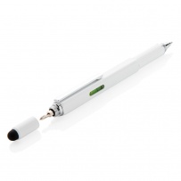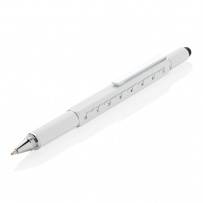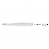 Multifunction pen with ruler (7cm) , spirit level, screw driver, stylus tip and ballpoint with blue writing ink (up to 400m) Made out of high quality brass material with aluminium clip.