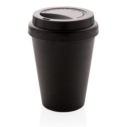 Kubek termiczny 300 ml, lekki, trwały i wielokrotnego użytku, wykonany z materiału PP w 100% nadającego się do recyklingu, podwójne ścianki, zakręcane wieczko, odporny na temperaturę do 100 stopni Celsjusza, wyłącznie mycie ręczne, ślad węglowy produktu: 0,36 kg CO2