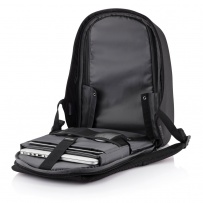 Plecak chroniący przed kieszonkowcami Bobby Hero Regular, wodoodporny i odporny na przecięcia materiał, wykonany z materiału RPET, ukryte zamki i kieszenie, wewnątrz miękkie przegrody na laptopa 15,6" i tablet do 12,9", zintegrowany port USB do ładowania telefonów (power-bank nie jest dołączony), odblaskowe paski zwiększające widoczność, pasek do zamocowania na walizce, wzór zastrzeżony?, ślad węglowy produktu: 6,68 kg CO2