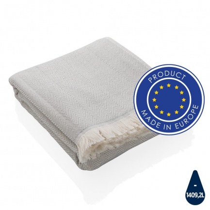 Our most luxurious and versatile towel. The perfect travel companion in any circumstance. It's made from 78% OEKO-TEX-certified cotton (produced without harmful substances or dyes) and 22% recycled cotton that's super soft and silky to the touch. With AWARE? tracer that validates the genuine use of recycled cotton. You can use it for almost anything, such as the beach, travelling, sauna, swimming pool, camping, sports, as a beach towel, bath towel, scarf, pareo, yoga towel, blanket, as a wrap for your child - you name it. Perfect for sofas and dressing beds, the Hisako throws are also wonderful for sunbathing on or using as a machine-washable picnic blanket. These four seasons hammam towels are quick-drying, mould resistant and incredibly easy to clean making them a brilliant choice for allergy sufferers, red wine lovers and beachgoers.  Each towel saves 1409,2 litres of water. 2% of proceeds of each Impact product sold will be donated to Water.org. Machine washable. Made in Europe