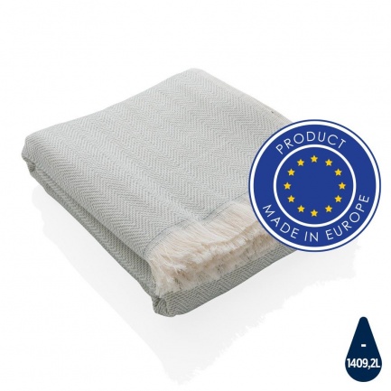 Our most luxurious and versatile towel. The perfect travel companion in any circumstance. It's made from 78% OEKO-TEX-certified cotton (produced without harmful substances or dyes) and 22% recycled cotton that's super soft and silky to the touch. With AWARE? tracer that validates the genuine use of recycled cotton. You can use it for almost anything, such as the beach, travelling, sauna, swimming pool, camping, sports, as a beach towel, bath towel, scarf, pareo, yoga towel, blanket, as a wrap for your child - you name it. Perfect for sofas and dressing beds, the Hisako throws are also wonderful for sunbathing on or using as a machine-washable picnic blanket. These four seasons hammam towels are quick-drying, mould resistant and incredibly easy to clean making them a brilliant choice for allergy sufferers, red wine lovers and beachgoers. Each towel saves 1409,2 litres of water. 2% of proceeds of each Impact product sold will be donated to Water.org. Machine washable. Made in Europe