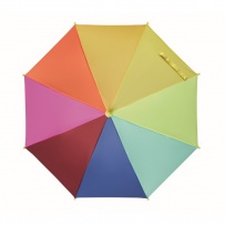 18 inch kids umbrella in 190T pongee with rainbow pattern. It has 8 panels. Manual opening and closure. Fibreglass ribs and frame. Plastic handle and tips. Curved handle.