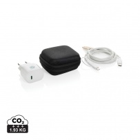 Zestaw do ładowania 2 w 1, ładowarka ścienna USB typu C 20W, kabel 3 w 1 60W, końcówki: 2 x USB C, iOS, wykonane z ABS i TPE z recyklingu, wyjście ładowarki 5V/3A, 9V/2.22A, 12V/1.67A, 20W, całkowita zawartość materiałów z recyklingu obliczona w oparciu o wagę całkowitą przedmiotu: 59%
