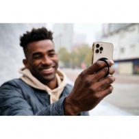 Magnetic phone holder with extra strong magnet. Compatible with all phones that come with an integrated magnet (iPhone 12 and higher) For Android compatible with phones that support QI2 other phones need a magnetic phone case. The aluminum ring can be folded out of make the phone into a stand (both horizontal and vertical) or as holder for holding your phone. Made with RCS (Recycled Claim Standard) certified recycled plastic and recycled aluminum. Total recycled content: 48 % based on total item weight. RCS certification ensures a completely certified supply chain of the recycled materials. Packed in FSC mix packaging.