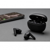 Bezprzewodowe słuchawki duszne, BT 5.3, posiadają funkcje ANC (do 23dB) i ENC, wykonane z ABS z recyklingu z certyfikatem RCS, wbudowany mikrofon, funkcja odbierania połączeń, etui z akumulatorem 200 mAh pełniące funkcję stacji ładującej w komplecie, akumulator słuchawek o pojemności 30 mAh umożliwia odtwarzanie muzyki na średnim poziomie głośności do 5 godzin z ANC lub do 7 godzin bez ANC, ponowne naładowanie za pomocą etui w 1,5 godziny, zasięg do 10 m, 3 rozmiary nakładek dousznych w komplecie, całkowita zawartość materiałów z recyklingu obliczona na podstawie wagi całkowitej produktu: 66%