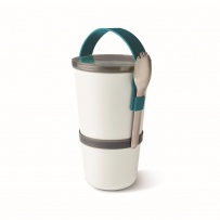 Miska śniadaniowa składa się z dwóch wodoszczelnych pojemników, które można połączyć ze sobą w celu przenoszenia, posiada silikonowy pasek do przenoszenia, który utrzymuje również łyżkę z funkcją widelca ze stali nierdzewnej, dostosowane do użytku w kuchence mikrofalowej, można myć w zmywarce z wyjątkiem tritanowej pokrywki