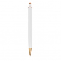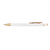 Długopis z kolorowym trzonem i błyszczącymi elementami kolorze różowego złota, wkład w niebieskim kolorze, produkt wykonany z aluminium