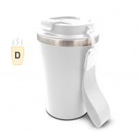 Kubek termiczny 350 ml, posiada podwójne ścianki ze stali nierdzewnej z recyklingu i plastiku, pasek ułatwiający noszenie lub przypięcie, produkt wykonany ze stali nierdzewnej z recyklingu i PP, utrzymuje temperaturę napojów gorących do 4 godzin +leakproof