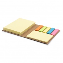 Memo holder, features 100 blank yellow sticky notes, 125 small sticky notes (5 colours, 25 pcs each) and 25 larger yellow sticky notes, product made of cardboard and paper