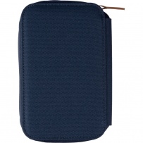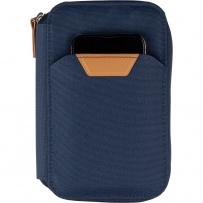 Travel wallet for documents, passport, driving license, ID card, includes mobile phone holder, multiple compartments, small front pocket, with RFID protection which enhances data security, product made from RPET