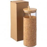 Travel mug 450 ml, single borosilicate glass wall, in a cork sleeve, suitable for cold and warm drinks, comes with a straw for easy drinking and a lid made of bamboo