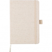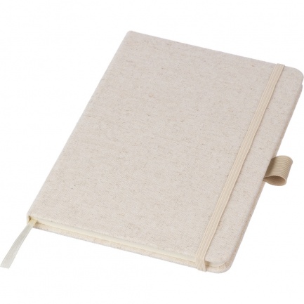 Notatnik ok. A5, posiada 80 stron w linie, tasiemka zakładkowa umożliwia wygodne zaznaczanie ostatniej strony lub ważniejszych notatek, dodatkowe zamknięcie w postaci dopasowanej kolorystycznie elastycznej opaski, posiada otwór na długopis, zmieści się do szkolnego plecaka, ikona konopi na produkcie, produkt wykonany z konopi