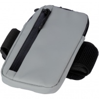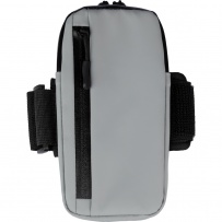 Armband functioning as a case for mobile phone, designed to be worn on the arm, useful during sports and exercise, includes a large waterproof zippered compartment, small pocket inside and waterproof pocket on the front, product made from polyester