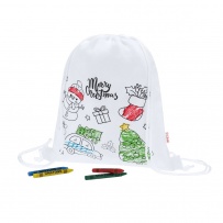 Children's Christmas backpack made of non-woven RPET, specially designed for colouring with crayons. With fun Christmas drawings, including 4 crayons in different colours. It has self-closing strings and fabric fasteners, and a RPET label outside.RPET material is made from recycled plastic, thus promoting the reuse of plastic waste and helping the sustainability of the planet.