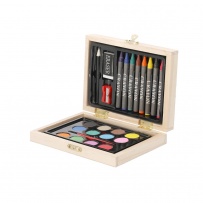 Set of 24 pieces presented in a wooden coloring case with closure and metal hinges. Contents: - 1 pencil - 1 eraser - 1 sharpener - 8 crayons of various colors - 1 brush - 12 watercolors of various colors.