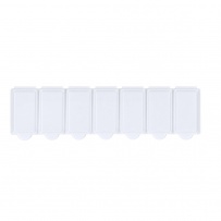 Weekly pill organizer made of durable solid white PP material. Includes 7 individual compartments with safety closures. BPA free.
