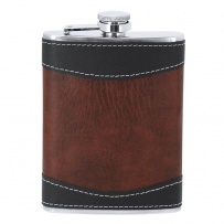 Original hip flask set with wood finish and chessboard design. Includes safety closure and stainless steel accessories coated in PU. Contains a 220ml hip flask with leak-proof screw cap, a shot glass, a practical funnel, a poker card deck, and six red dice. Presented in an elegant case with chessboard and molded foam interior, includes 16 beige chess pieces and 16 brown.