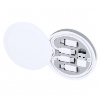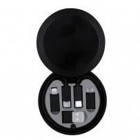 Set of charging cables in ABS. Includes: Type-C cable, USB adapter, Micro USB adapter, and 2-in-1 adapter (Micro USB and Lightning). Presented in a case with a carabiner.