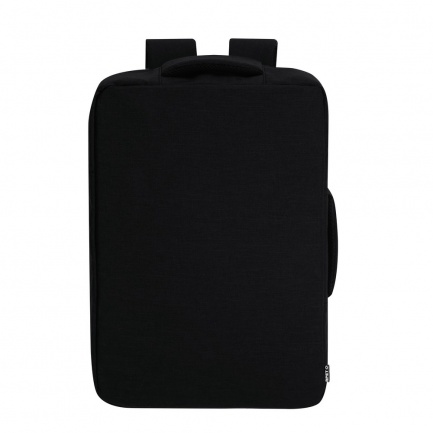 Document holder backpack made from durable RPET 300D. It features an urban design that incorporates a main pocket with a hidden zipper closure for added protection, with dual pullers. Includes a padded interior for laptops up to 15 inches, additional pockets inside for small items. Its shoulder straps and back are padded and adjustable for added comfort. Offers three transport modes: as a backpack, thanks to the padded shoulder straps; as a document holder, thanks to its carrying handle; and a strap for a trolley. The RPET material is made from recycled plastic, promoting the reuse of plastic waste and helping the planet's sustainability.