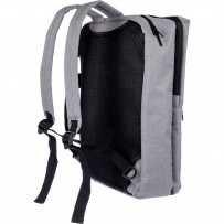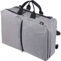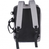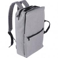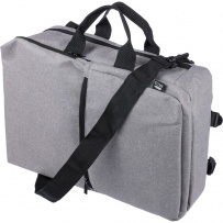 Backpack for a 15" laptop with a lining inside, capacity of the backpack is 1 l, features a handle for carrying in the hand and two side handles, two large compartments with a zipper, including one with a compartment for a 15" laptop with a hook and loop closure, a small front pocket fastened with a zipper, inside there is a separate adjustable shoulder strap for attaching to plastic hooks (4 plastic hooks in total), two adjustable shoulder straps are hidden behind the padded back, which allows you to wear the bag like a backpack, perfect for traveling, includes RPET icon on tag, products made from RPET, polyester, mesh and foam