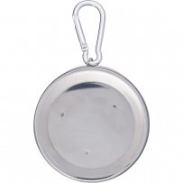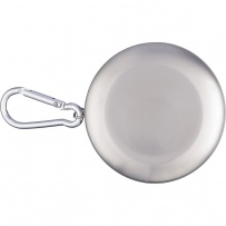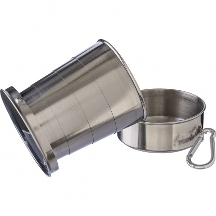 Składany kubek podróżny 220 ml z metalowym karabińczykiem umożliwiającym przypinanie, składana konstrukcja ułatwia pakowanie i przenoszenie, zapakowany w brązowy kartonik, produkt wykonany ze stali nierdzewnej