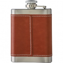 Piersiówka 100 ml, na zewnątrz otoczona eleganckim materiałem z PU, zapakowana w brązowy kartonik, produkt wykonany ze stali nierdzewnej i PU