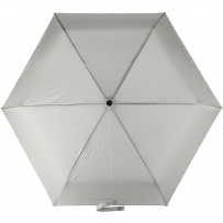 Automatic umbrella with 6 panels and RPET fabric, includes RPET icon on the tag, hook and loop tape and pouch, with a carabiner that allows to attach the umbrella to bag when traveling, also protects against the wind, product made from plastic, RPET, fiberglass